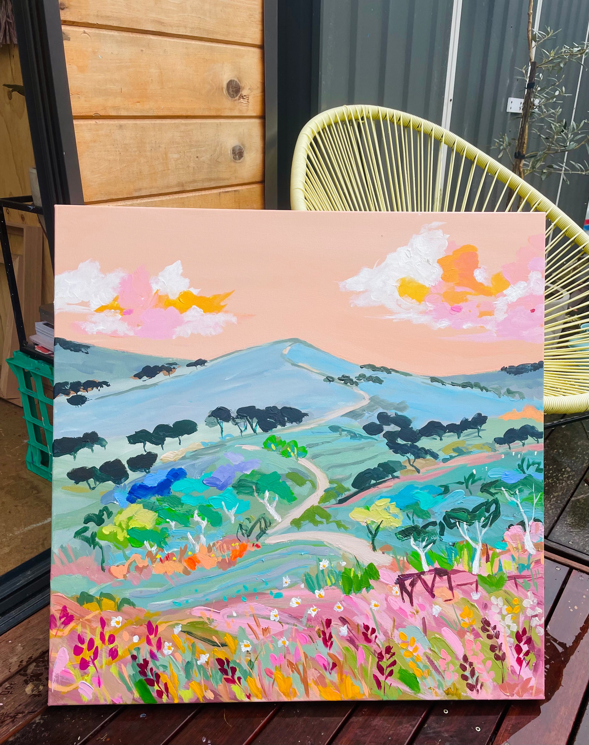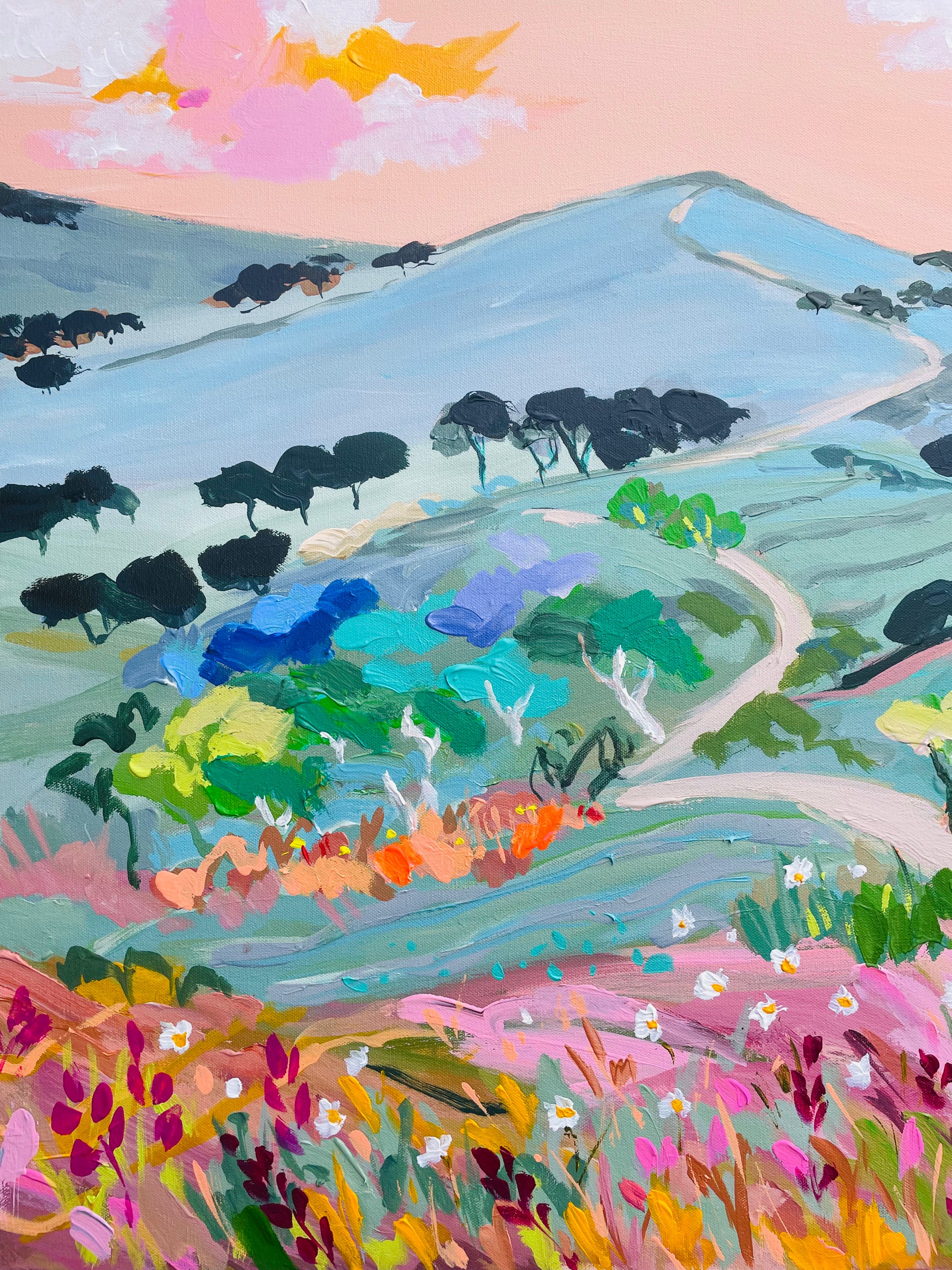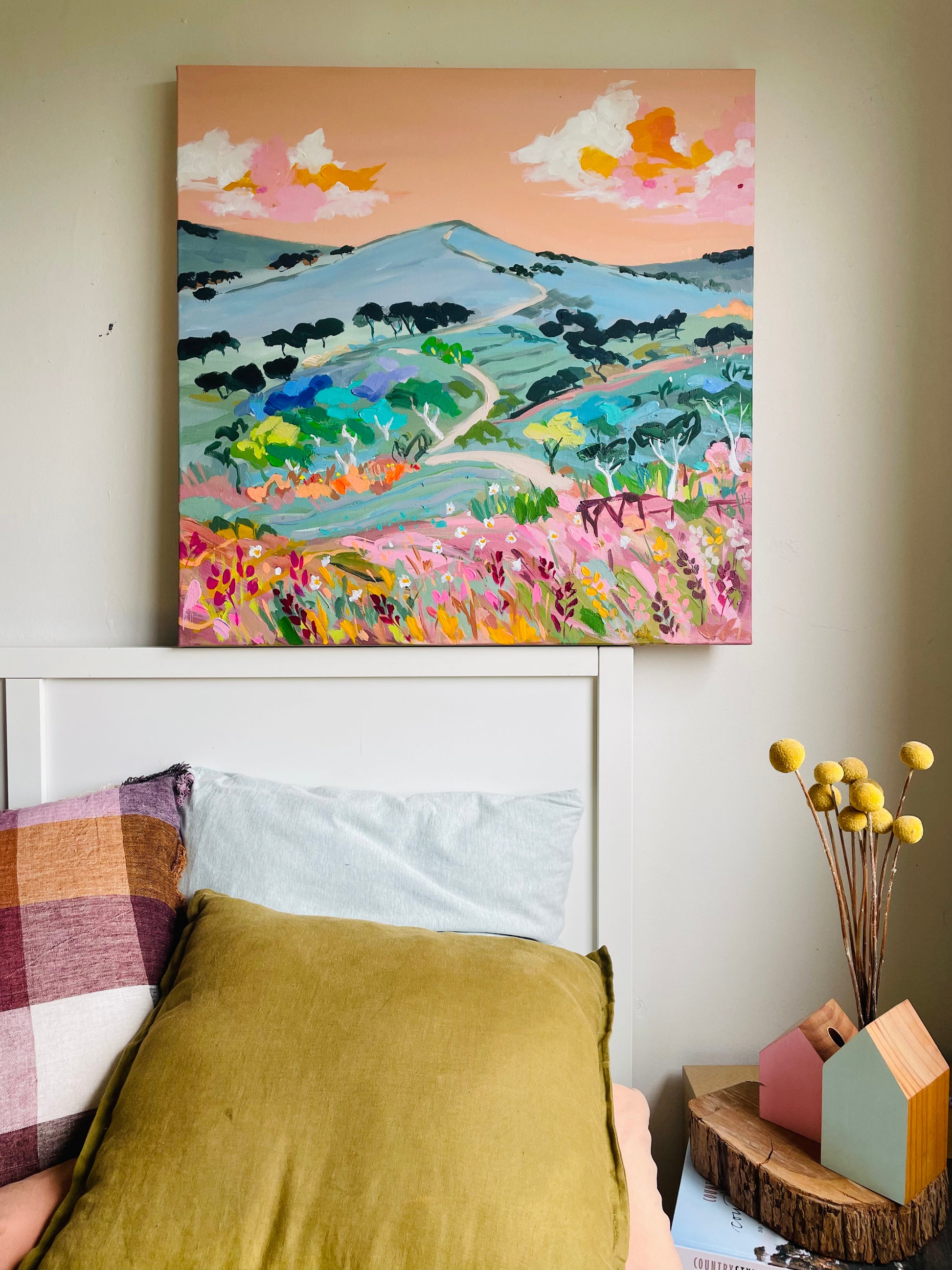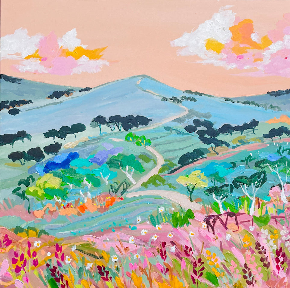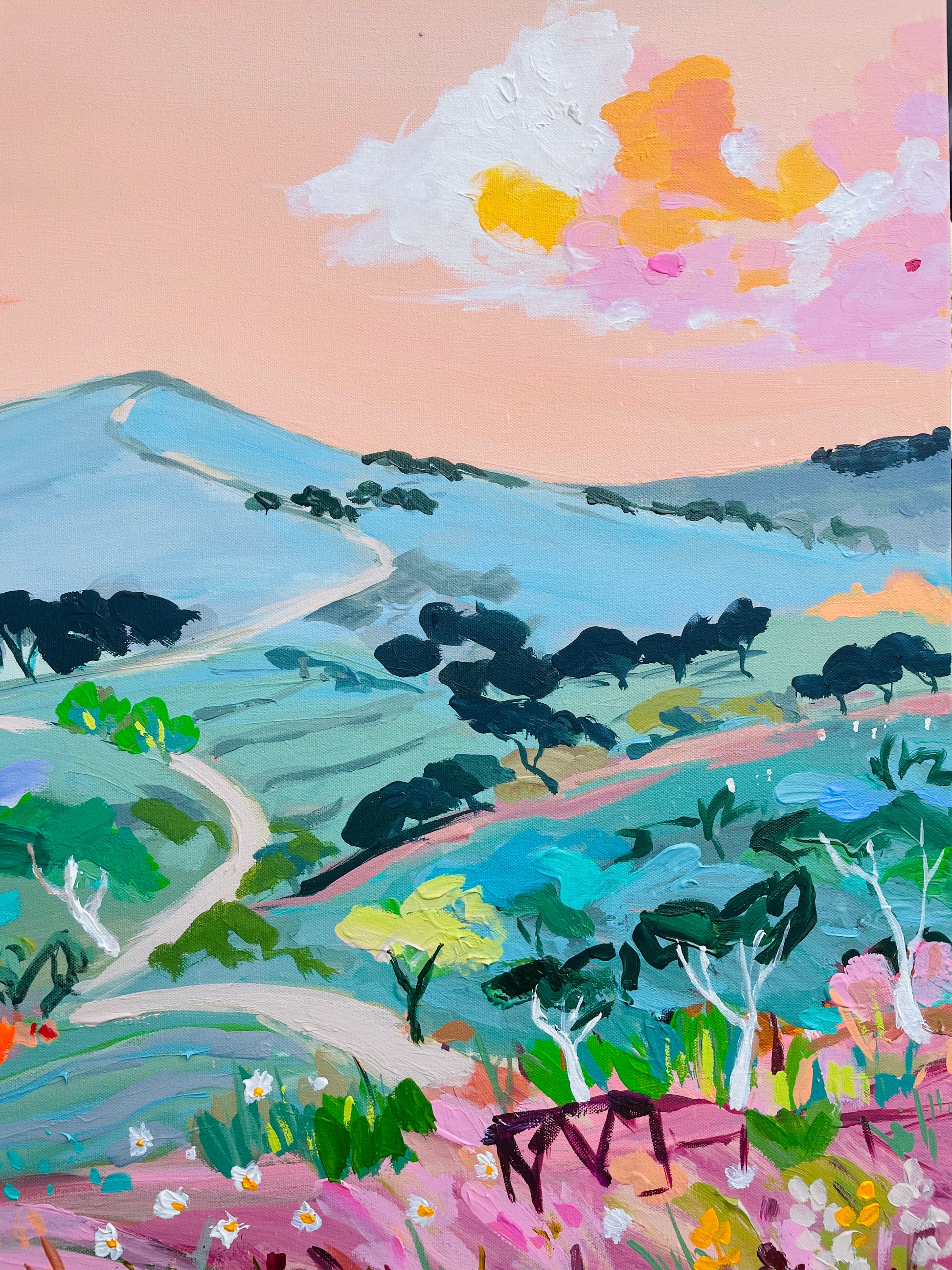 This painting is inspired by all the country road travel we had , it is full of texture and packed with all my happy colours